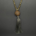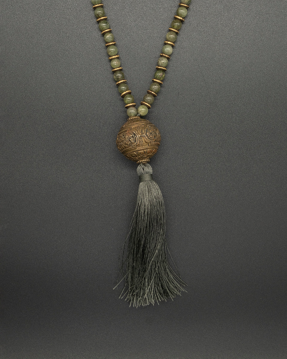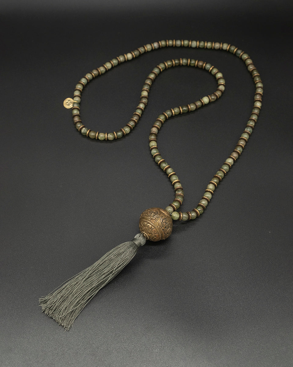 A serene strand of light green kyanite, delicately hand-knotted into 108 beads and crowned with a warm brass guru bead. Each bead carries a gentle, clarifying energy, inviting calm, balance, and inner focus. A graceful companion for meditation, reflection, or mindful moments throughout your day.