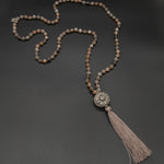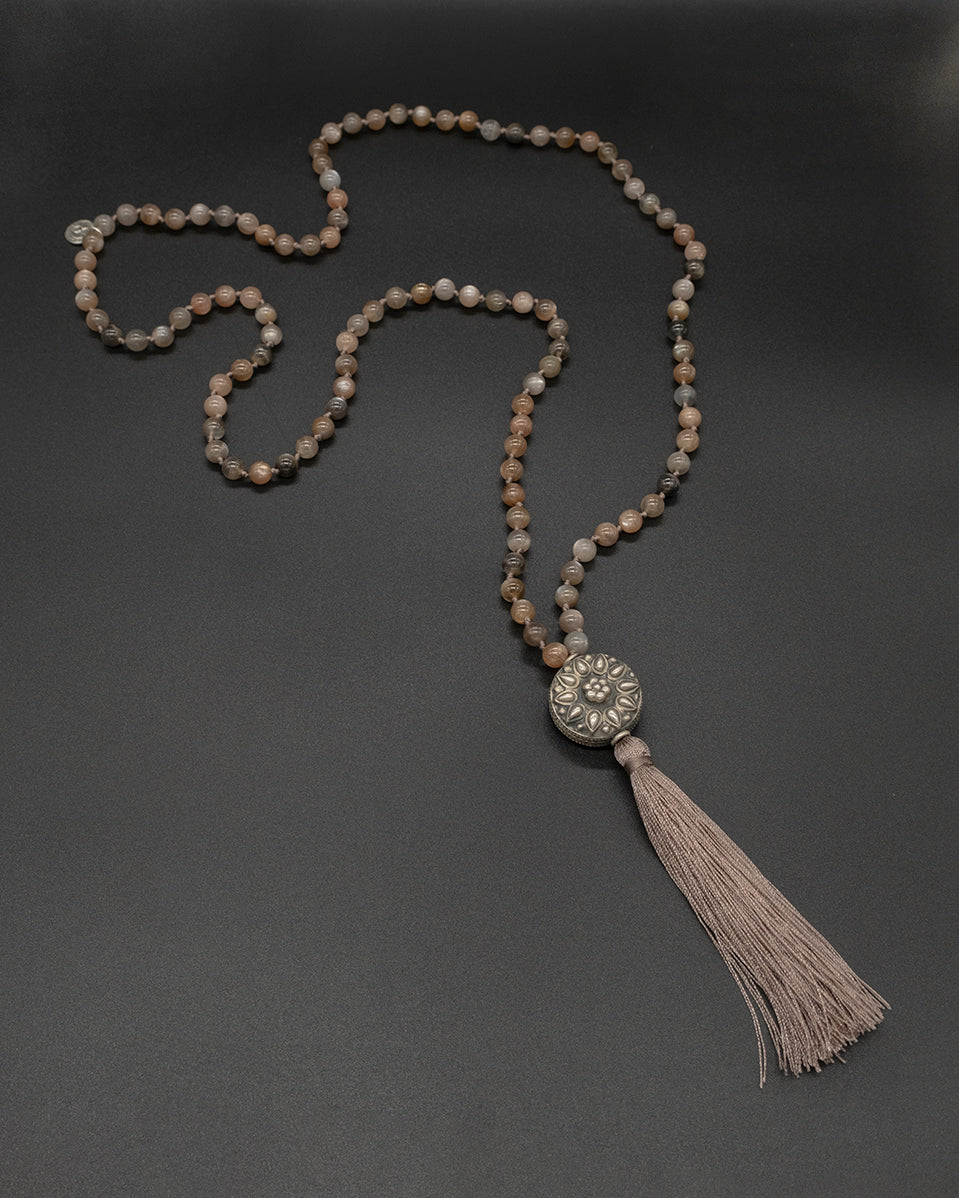 Illuminate your spirit with this Multi Moonstone 108 mala, a celebration of feminine energy and inner balance. The natural play of colors in each moonstone reflects intuition, emotional harmony, and new beginnings. Finished with a handcrafted silver Rajasthan flower guru bead, this mala carries the artistry and soul of Indian tradition—an elegant piece for meditation, intention setting, or everyday grace.