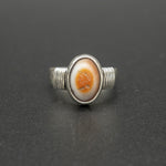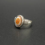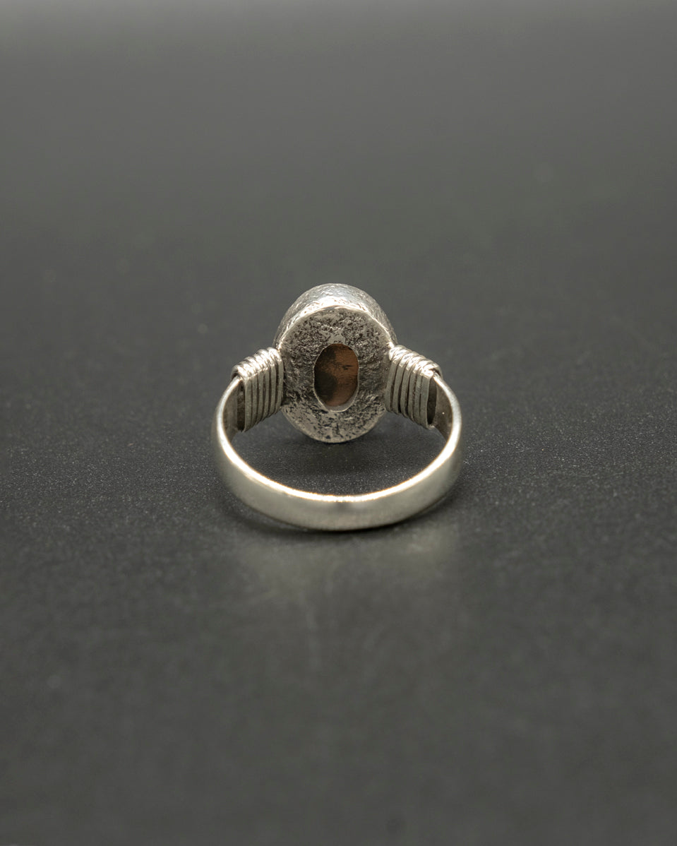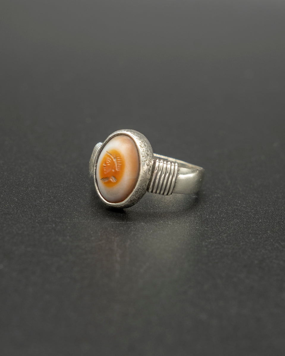 Gorgeously crafted, this ring features a meticulously carved warrior in agate. Anchored on a band of polished sterling silver, the golden agate carving stands boldly out in contrast. The band is enriched with side wired detailing, adding an extra layer of touchable texture to this exclusive piece.