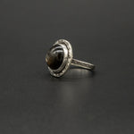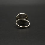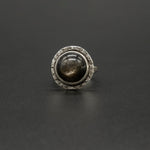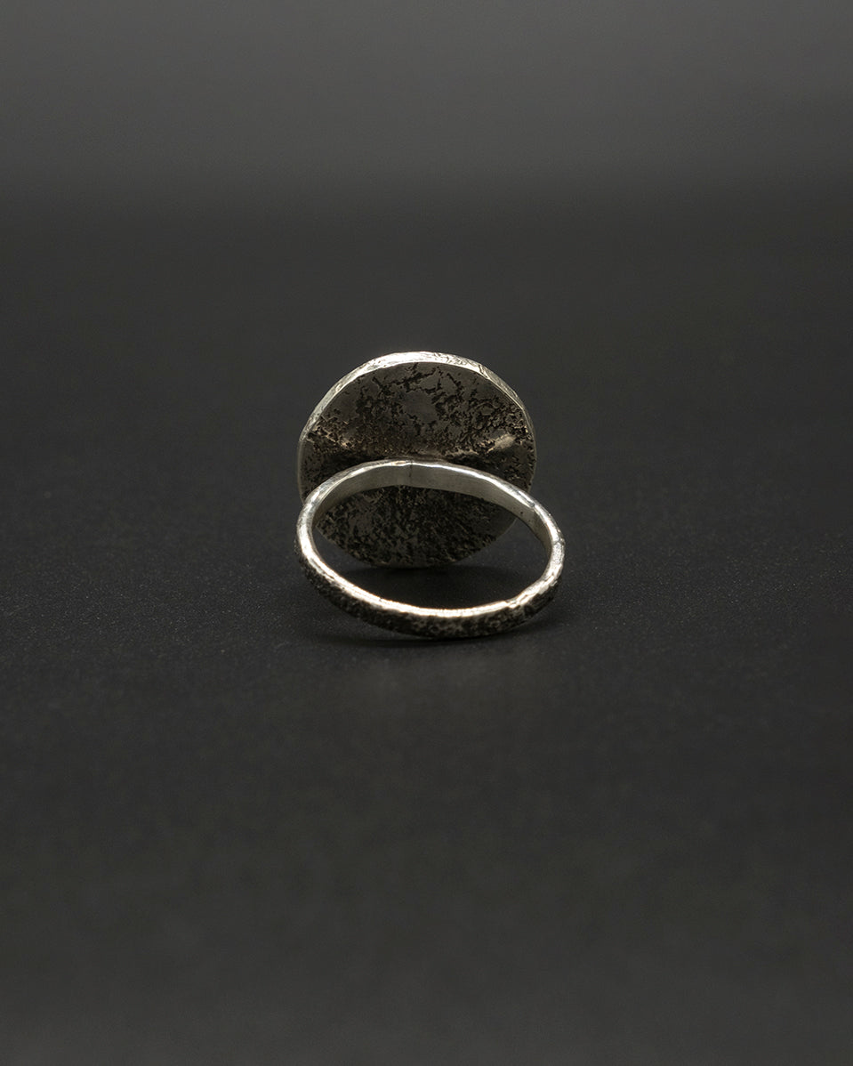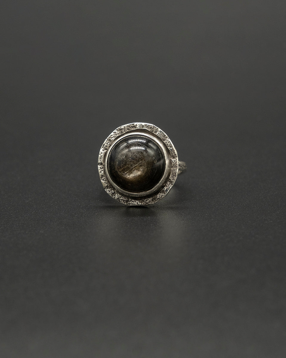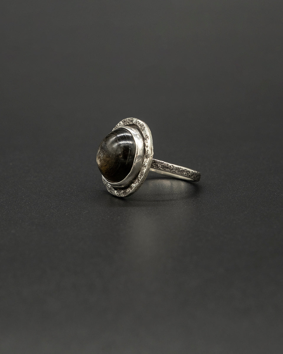 A striking piece set with black golden mica, its natural shimmer glowing like hidden embers. The hand-textured silver band adds earthy character, creating a bold contrast of shadow and light—raw, powerful, and beautifully grounded.