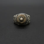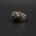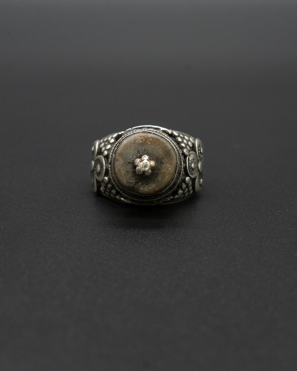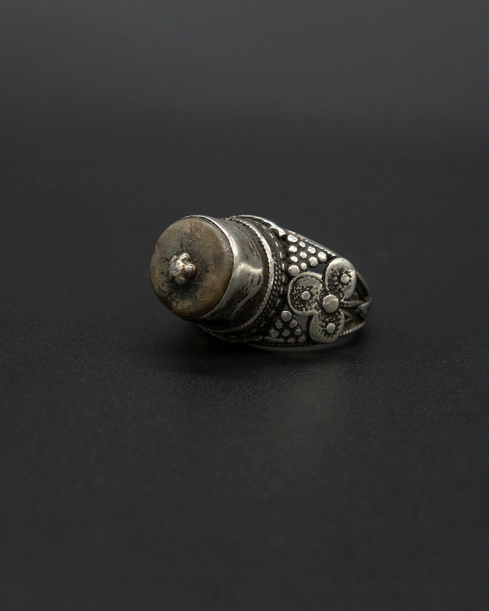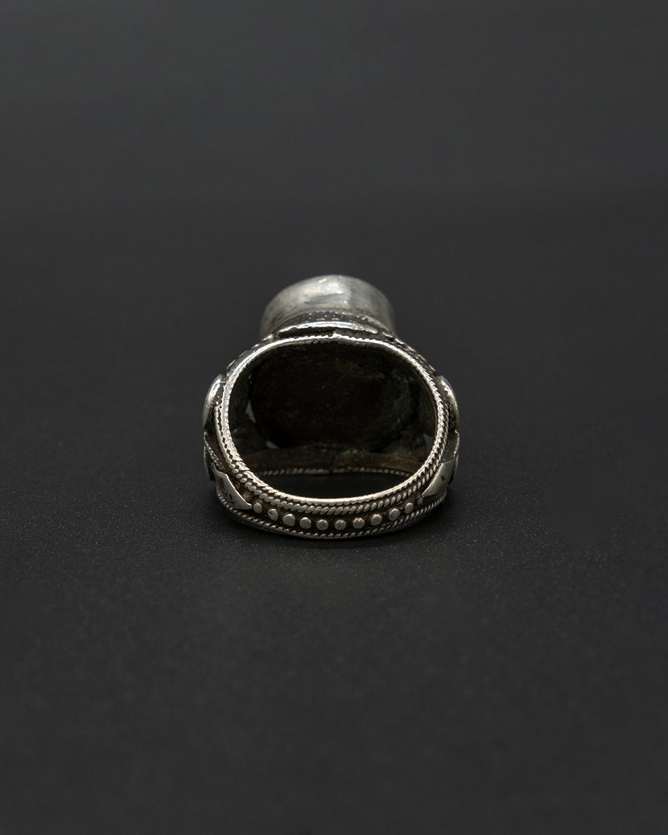 A classic Yemeni silver ring set with a deep green agate, cherished for its calming, protective energy. Handcrafted with traditional detailing and natural patina, it carries the warmth of old-world craft—quietly elegant, timeless, and full of spirit.