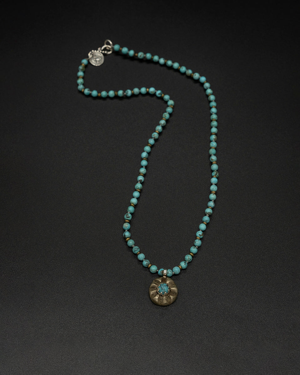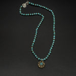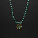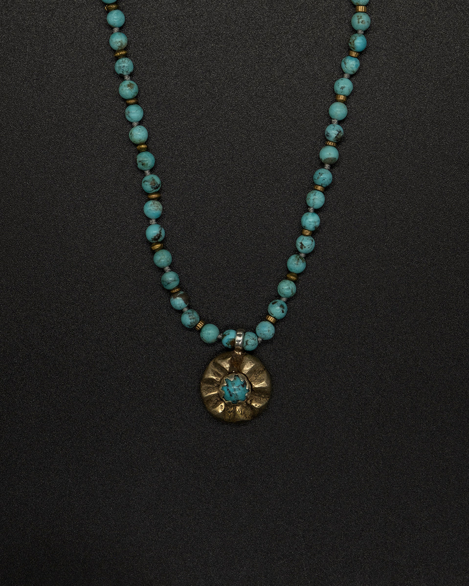 A timeless statement piece featuring a vintage Persian turquoise pendant set in warm brass, paired with a turquoise brass chain. The natural blue hues and antique finish create a beautifully earthy, soulful look—perfect for adding a touch of protection.