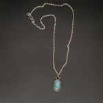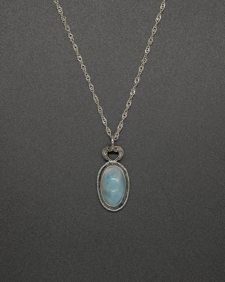 This piece features a larimar accented with heart-shaped delicate diamond, set on a silver chain. Calm and luminous, it carries a gentle elegance inspired by the sea.