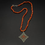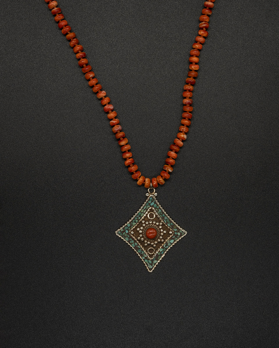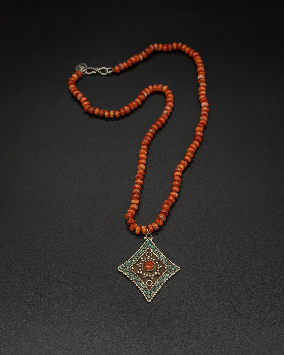 A vintage Tibetan turquoise and coral pendant rests beautifully on a shell chain, blending natural textures with timeless charm. This necklace carries a sense of protection, harmony, and spiritual strength, making it a meaningful talisman for everyday wear.