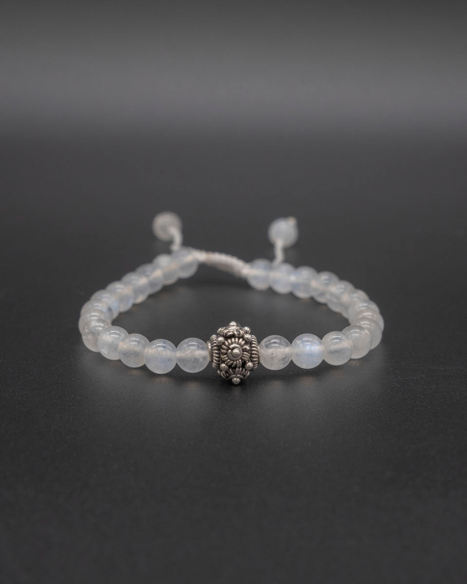 This rainbow moonstone bracelet features a stunning silver Balinese flower bead, giving it a unique and timeless quality.