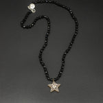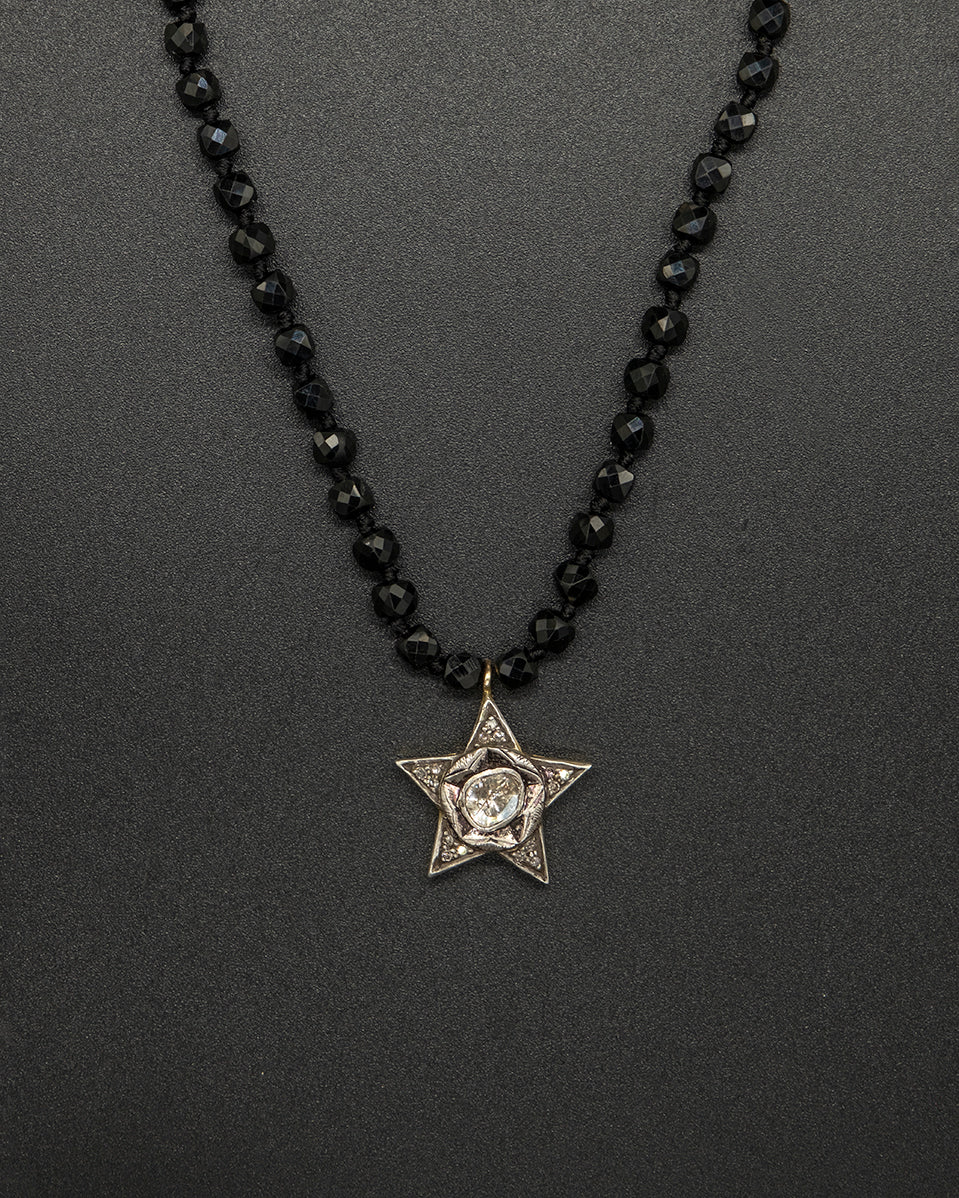 Raw Polki diamonds radiate antique brilliance, paired with a hand-knotted black spinel chain. A bold and elegant piece that balances grounding energy with timeless luminosity.