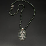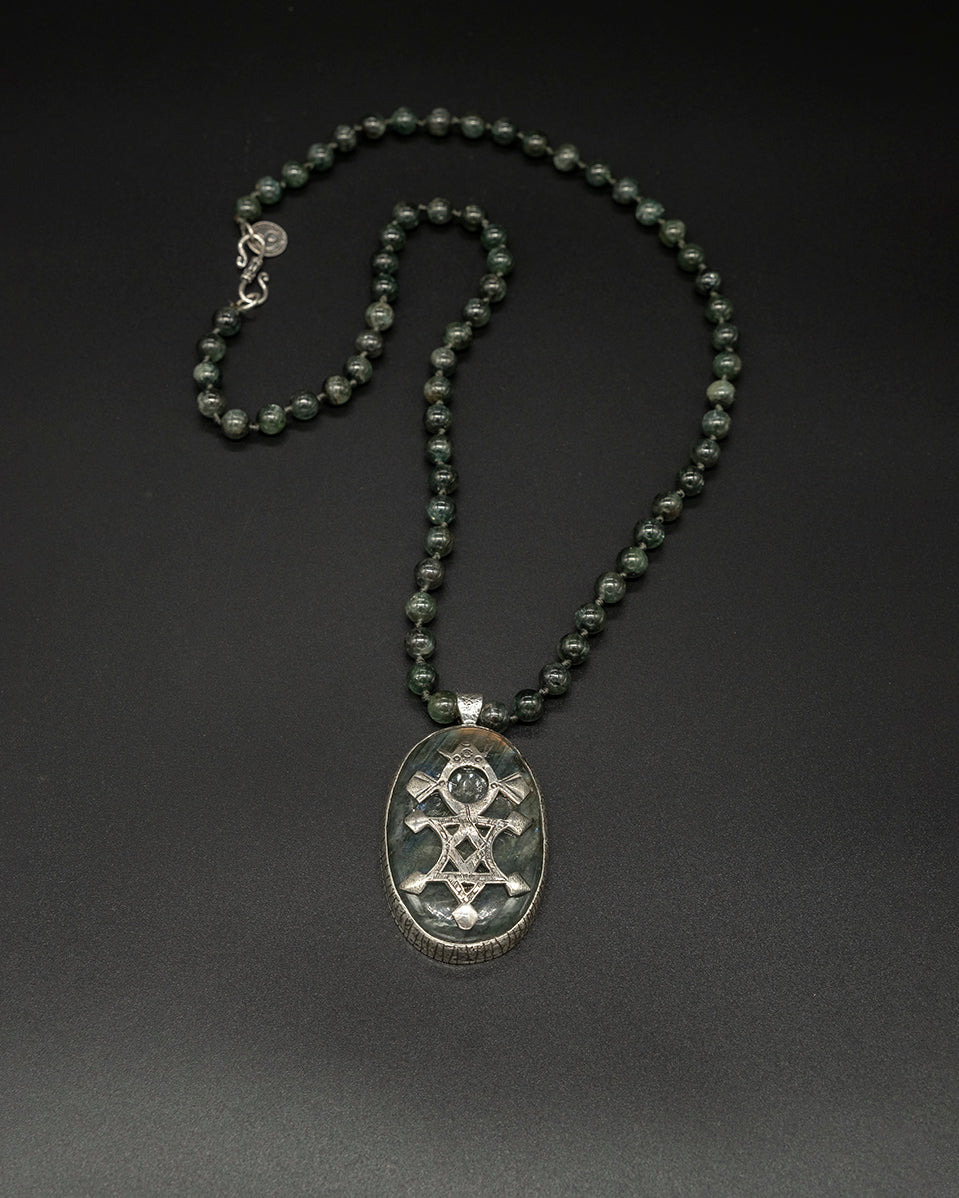 A silver Tuareg pendant with luminous labradorite, paired with a hand-knotted green kyanite chain. A piece that radiates intuition, balance, and ancient desert elegance.