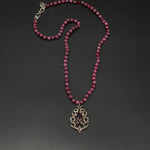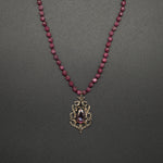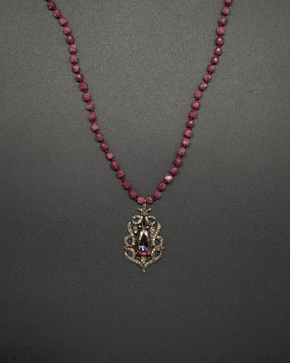 Behold the Ruby Queen, synonymous with regal elegance and unequaled craftsmanship. Its heart showcases a diamond and pink tourmaline pendant. Paired with a hand-knotted ruby  chain, the piece resonates with an enchanting fusion of antiquity and grace.