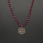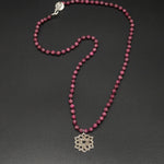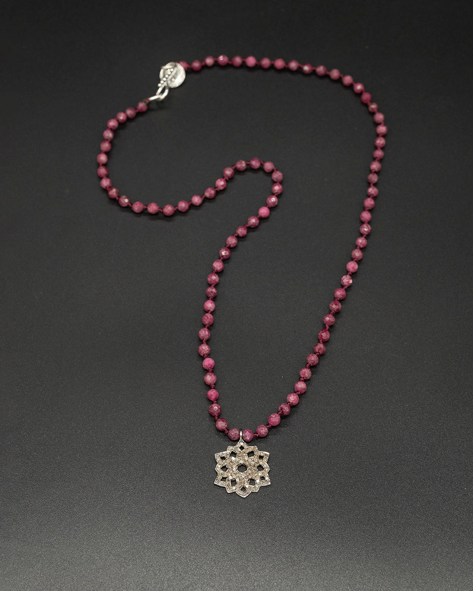 A radiant silver sun set with sparkling diamonds, paired with a hand-knotted ruby chain. A symbol of light and vitality, bringing warmth, courage, and luminous grace to the wearer.