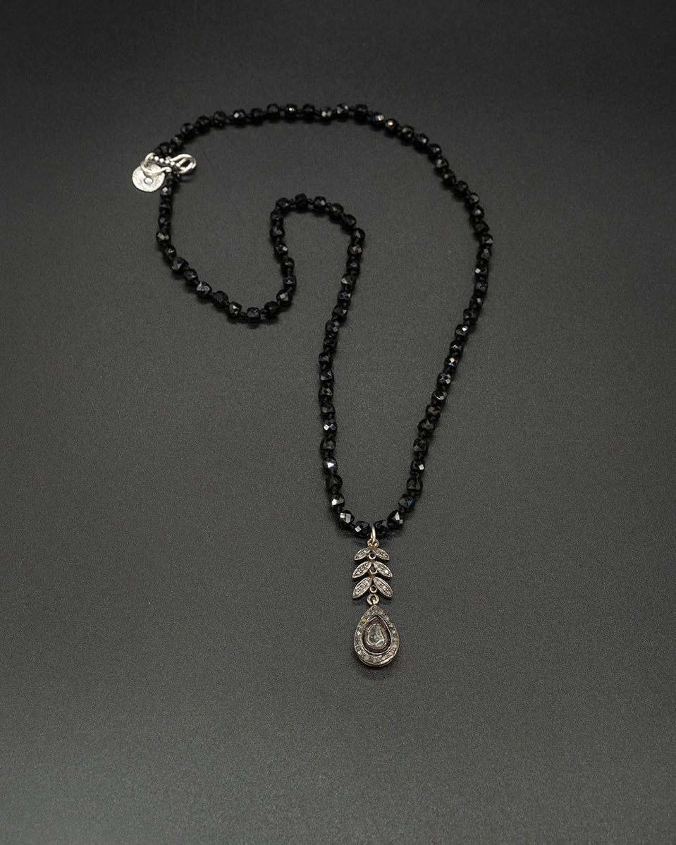 Polki Diamond set in polished silver, paired with a hand-knotted Black Spinel chain. A striking creation that embodies elegance and resilience, combining the raw brilliance of polki diamonds with the grounding energy of black spinel — a piece that reflects clarity, strength, and timeless sophistication.