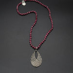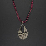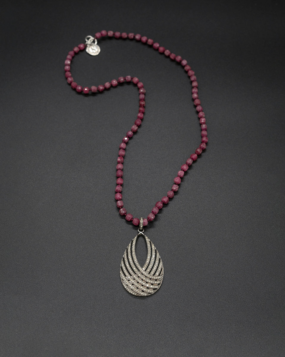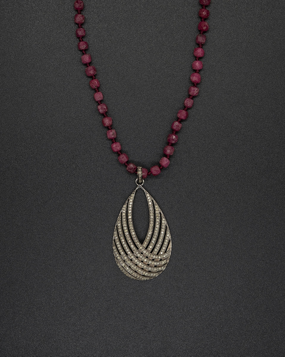 This elevated piece features a diamond encrusted twisting silver pendant, delicately hanging from a hand knotted ruby. In medieval Europe, rubies were worn as a symbol of wealth, good fortune, wisdom, and love.