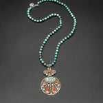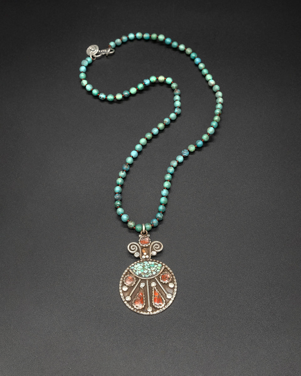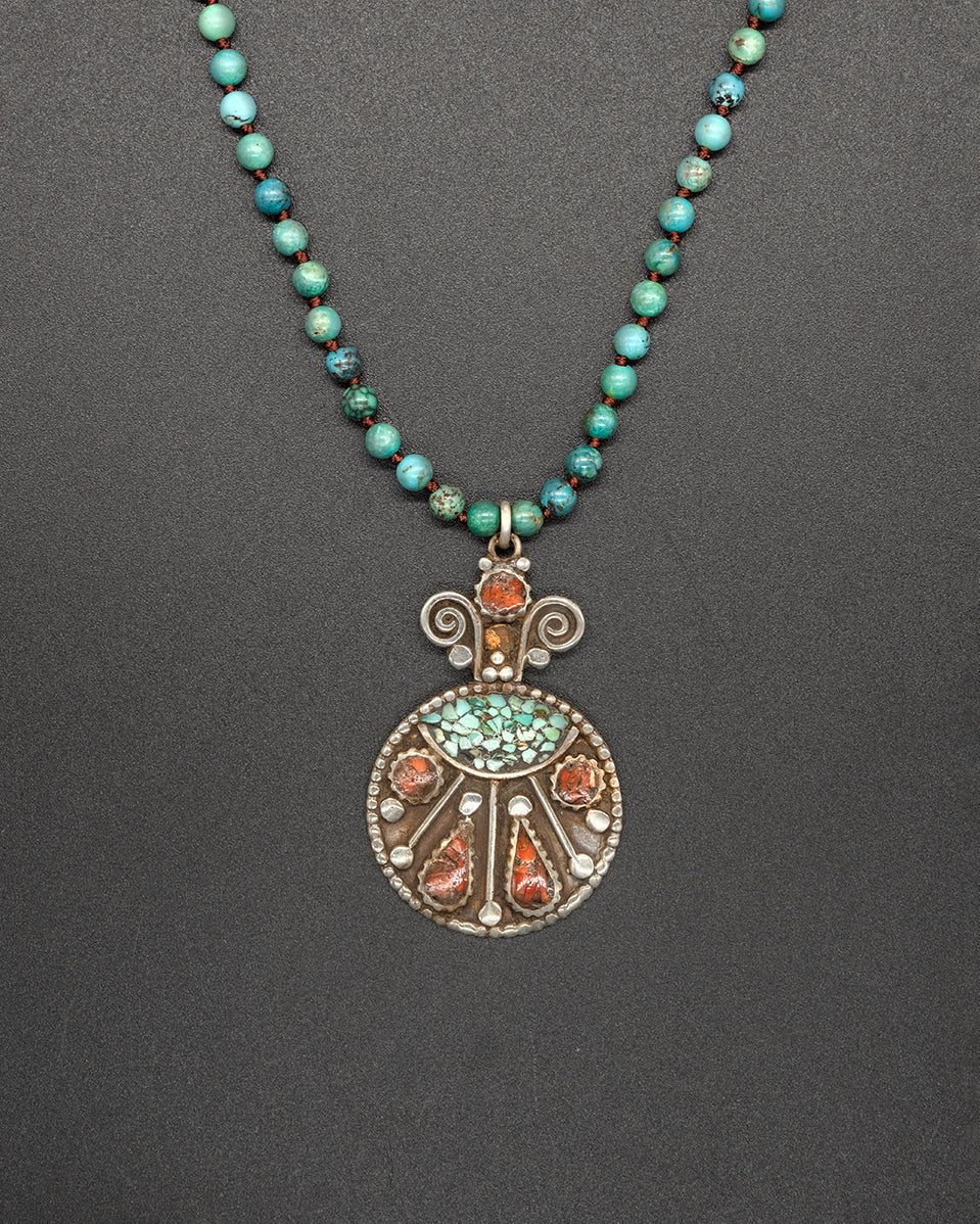 This piece features a vintage brass spiral adorned with coral and turquoise, gracefully set on an Arizona turquoise chain. Earthy and timeless, it reflects artisanal beauty and quiet strength.