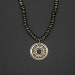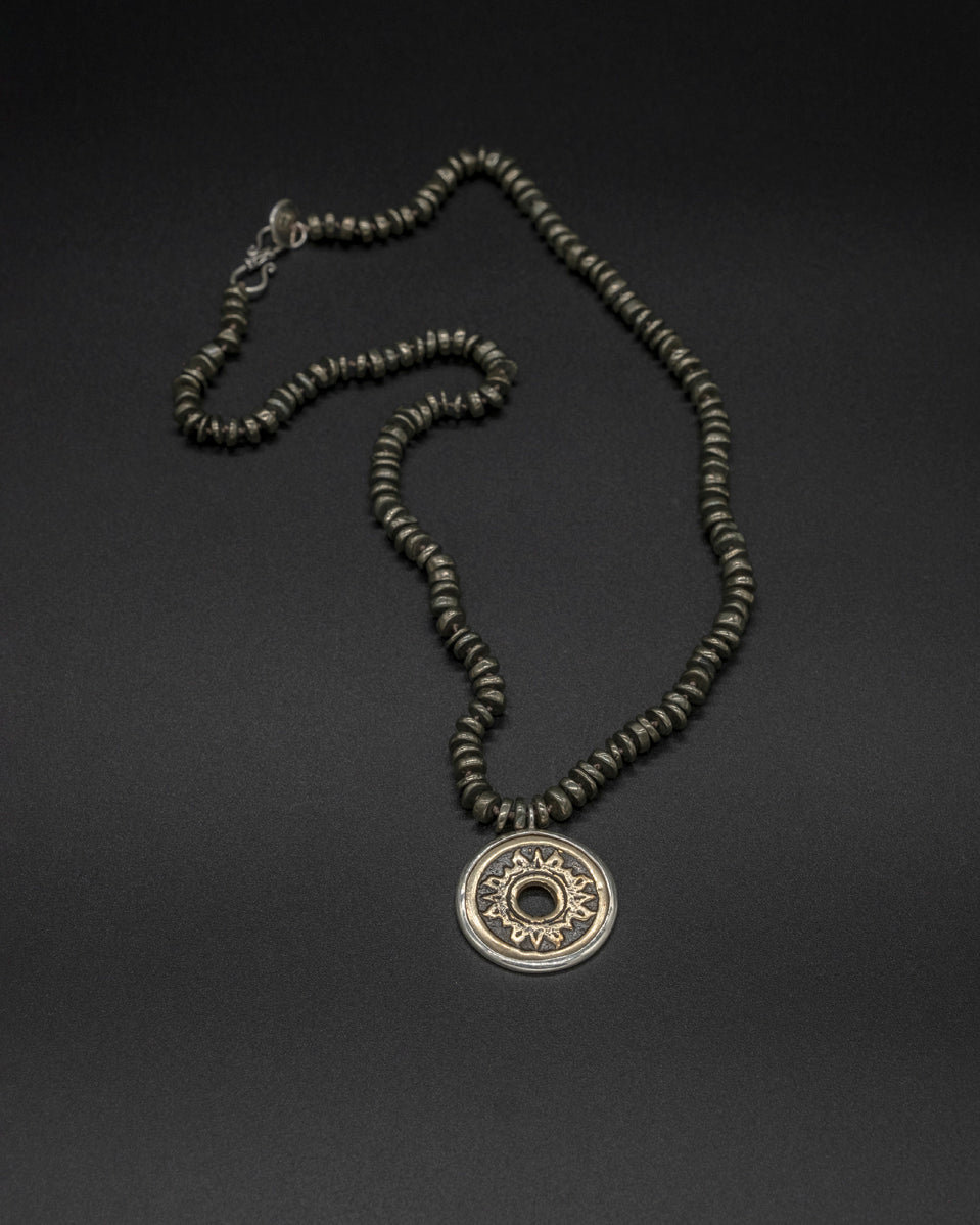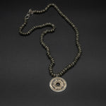 Inspired by divine power, this pendant features the Sudarshana Chakra, the celestial weapon of Lord Vishnu, symbolizing protection, righteousness, and clarity of vision. Paired with a hand-knotted pyrite chain, it radiates grounding energy and strength, blending spiritual power with earthly abundance.