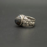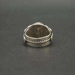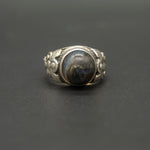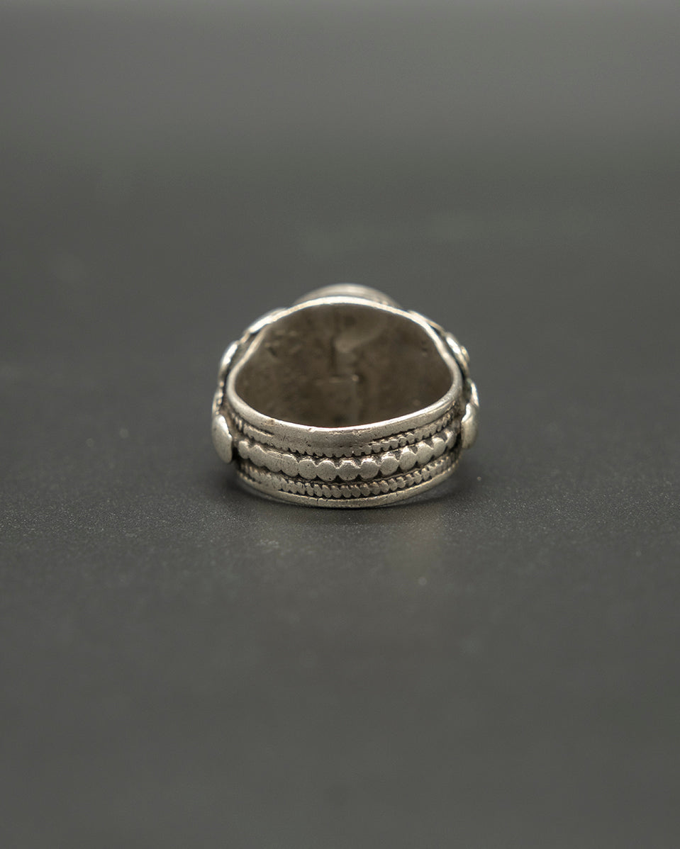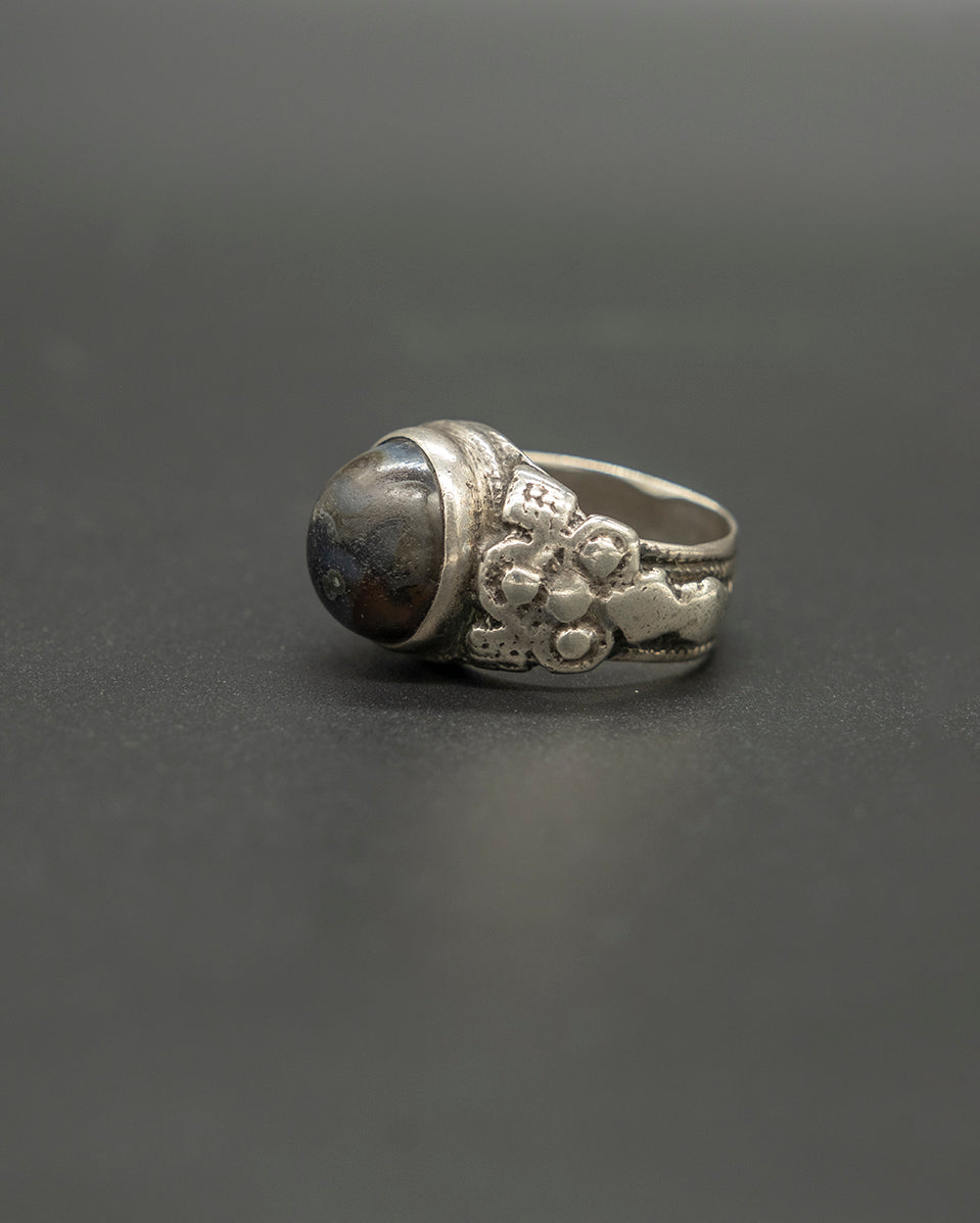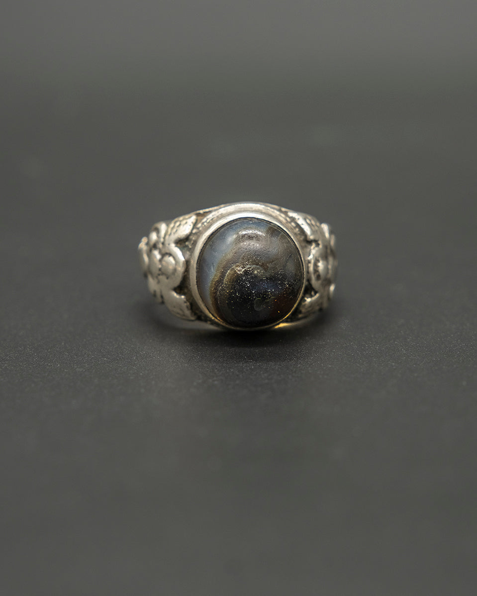 A Yemen grey agate set in aged silver, its soft, smoky tones glowing with subtle depth. The textured silver frame enhances the stone’s calm, mysterious beauty, creating a ring rich in heritage and quiet spiritual warmth.