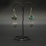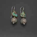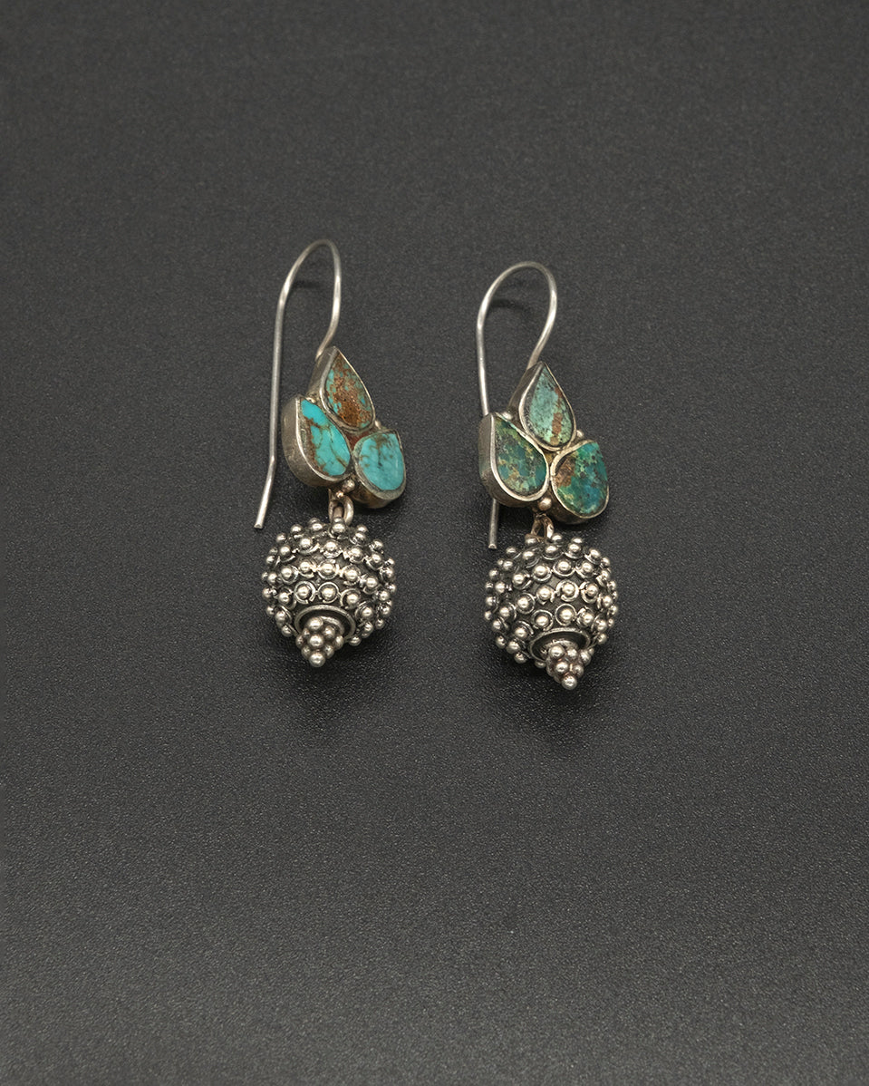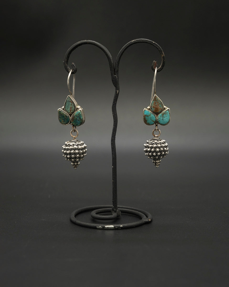 Handcrafted earrings featuring turquoise petal-shaped stones paired with silver spike ball details. A unique mix of soft natural color and bold silver accents, creating a playful yet elegant look—perfect for everyday wear or a standout touch.