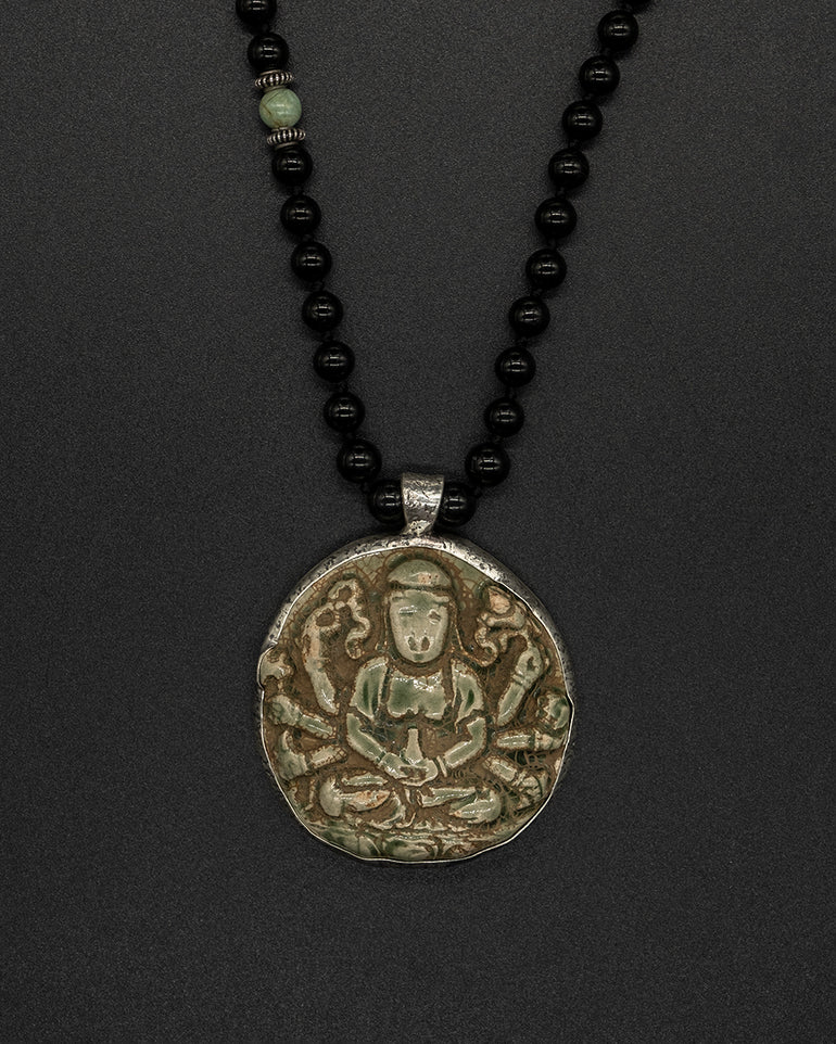 Skillfully carved from clay and delicately framed with silver, this vintage pendant encapsulates the timeless beauty of the Bodhisattva. Suspended on a hand-knotted black tourmaline chain, accented with wood opal & silver, it emits a captivating aura of peace and spirituality.