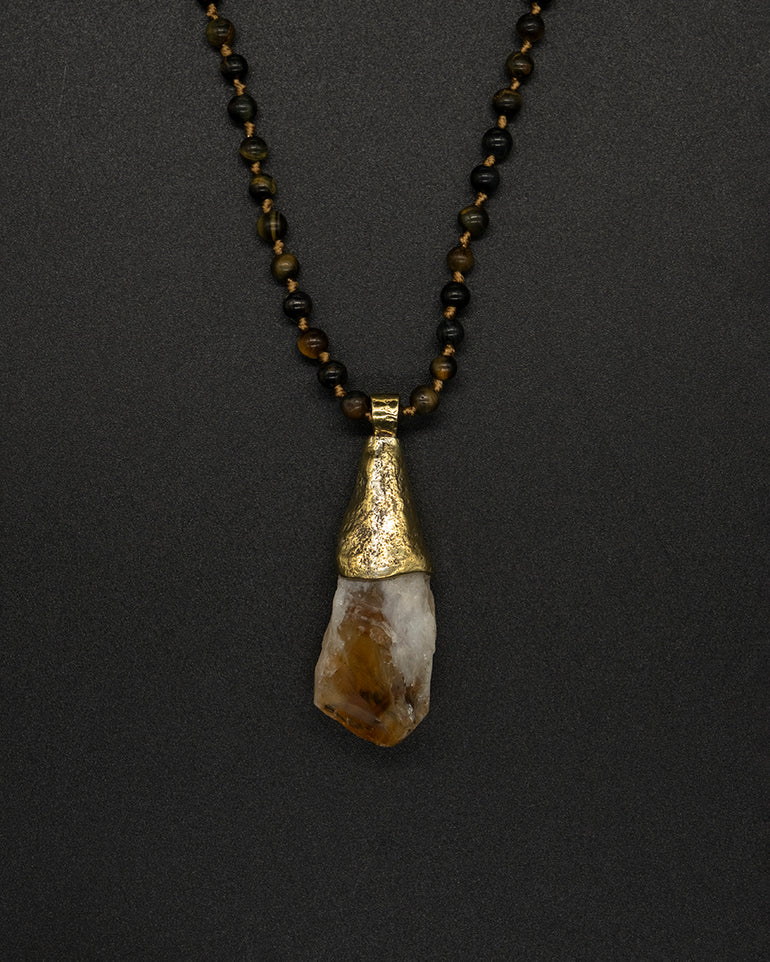 This exceptional piece is made with only the finest top-quality citrine crystal. This powerful healing crystal has been known aid in manifestation, creativity, and self-will. With a hand-textured brass cap and matching tiger eye chain, this necklace is a testament to raw beauty.