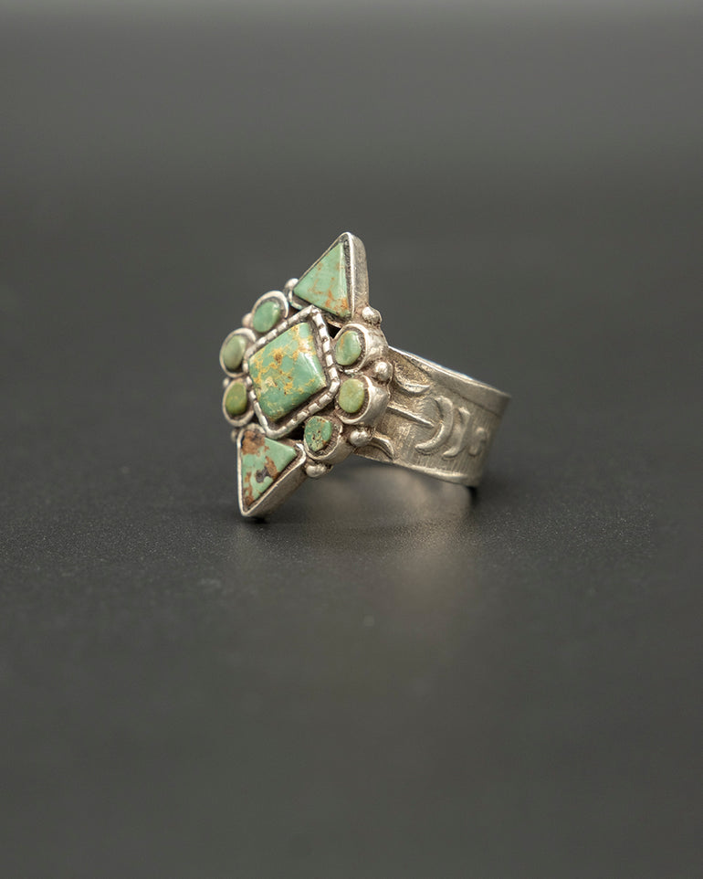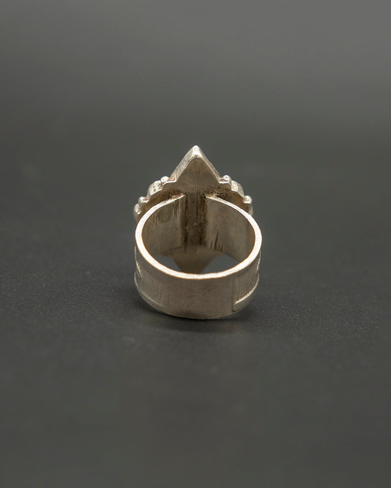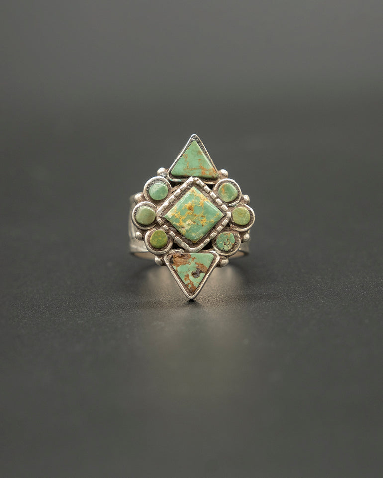Indulge in the beauty of Tibetan craftsmanship with this vintage silver & turquoise ring. Handmade with silver and adorned with a vibrant diamond shaped turquoise stone setting, this ring is a work of art.