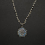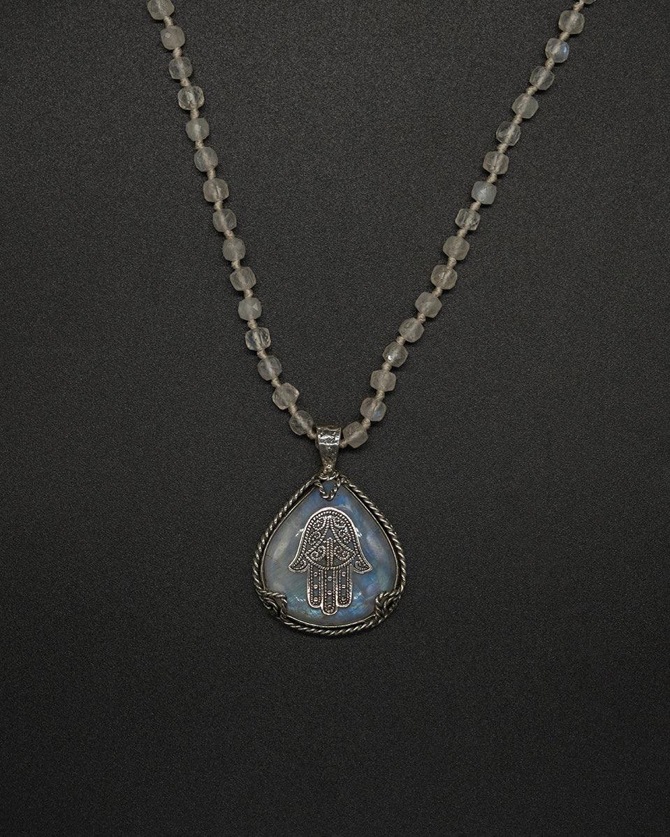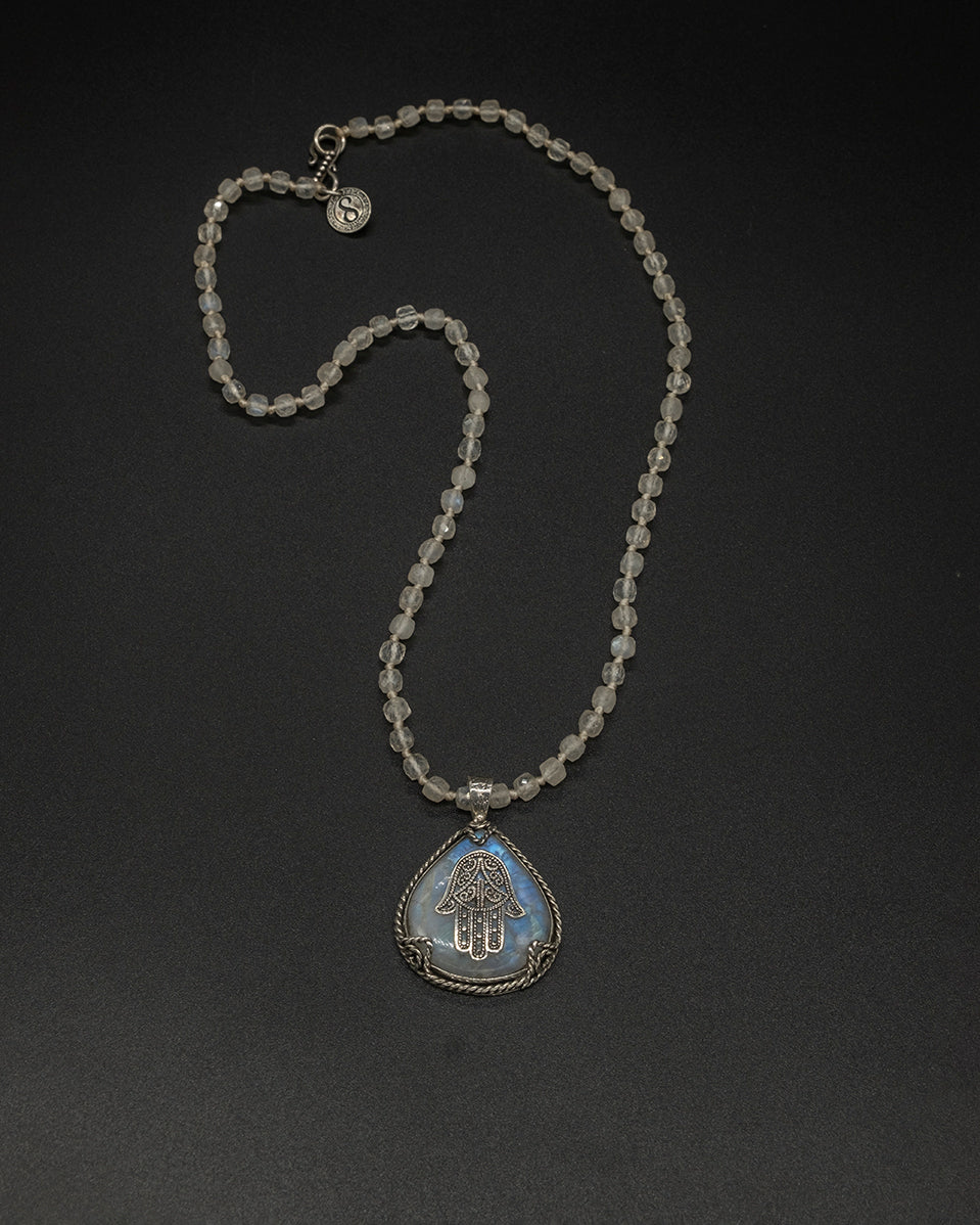 Capture the beauty of the moon with this handmade rainbow moonstone & silver Hamsa pendant, paired with a silver snake chain. Delicately crafted with gorgeous moonstone that shimmer in the light with unique attention to detail.