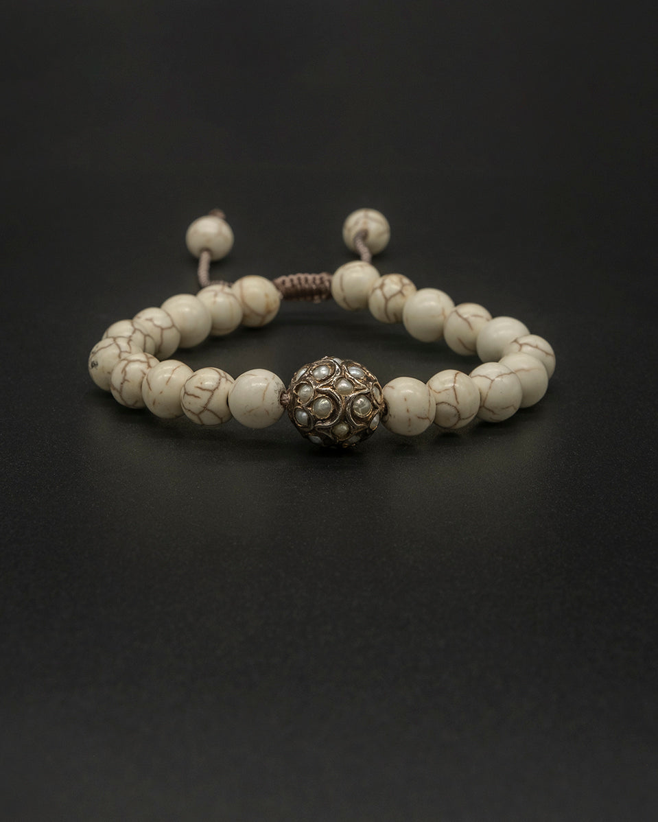 A vintage-inspired piece featuring a soft pearl accent combined with gold-plated howlite. Howlite is known for its calming and balancing energy. Elegant and timeless, perfect for both everyday wear and special occasions.