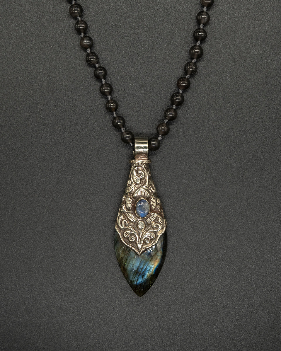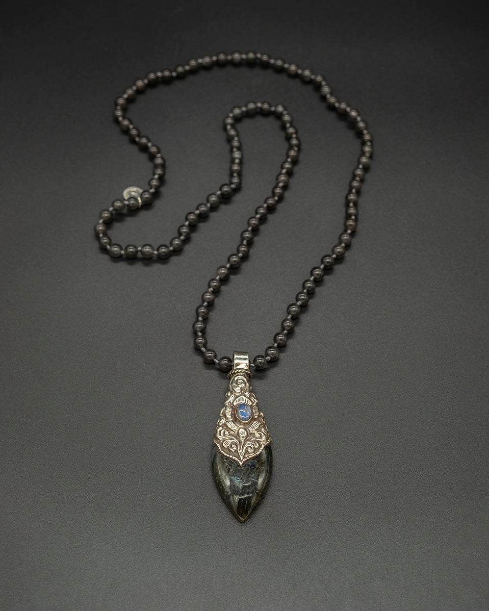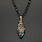 Enhance your ensemble with our labradorite teardrop pendant. Featuring a shimmering labradorite set in silver, it is paired with a matching labradorite chain that reveals subtle flashes of light and depth.
