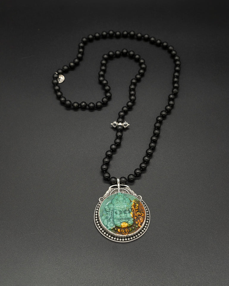 Embrace the spiritual significance and beauty of the Maha Kala pendant, perfectly framed in silver. Hanging on a shungite chain with a silver vajra accent. This exquisite piece represents the Maha Kala deity, revered for being a fierce protector of the dharma and a remover of obstacles.