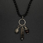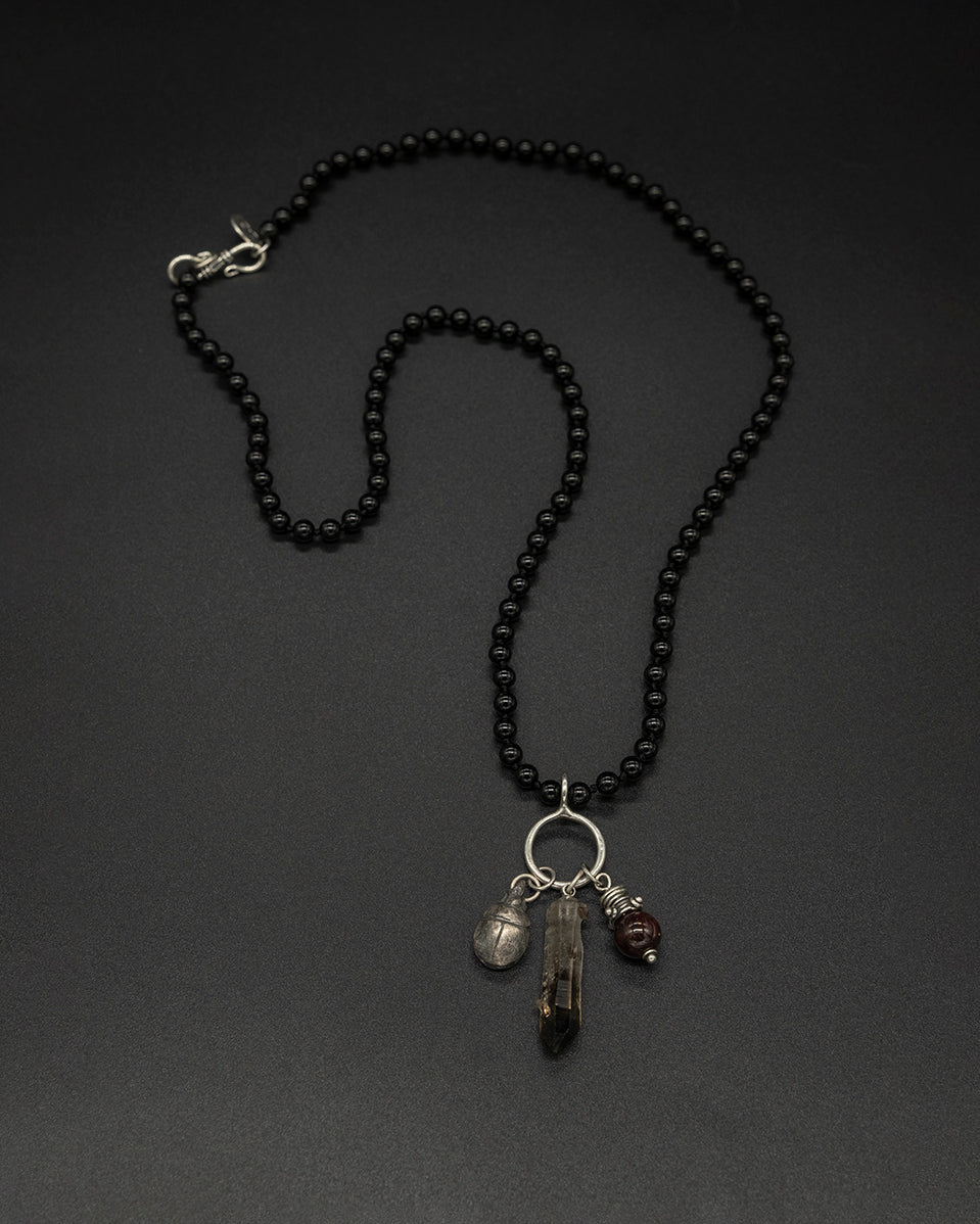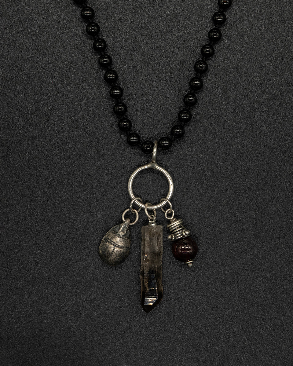 A multi-charm chain featuring scarab motifs with smoky quartz, red tiger eye, and black tourmaline chain. Designed as a symbolic piece of protection and transformation, carrying grounding energy and timeless character.