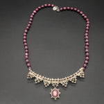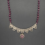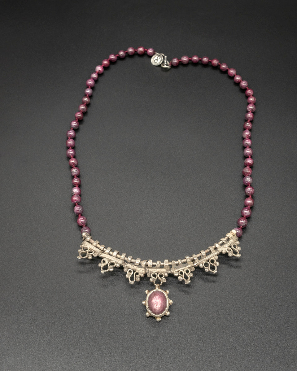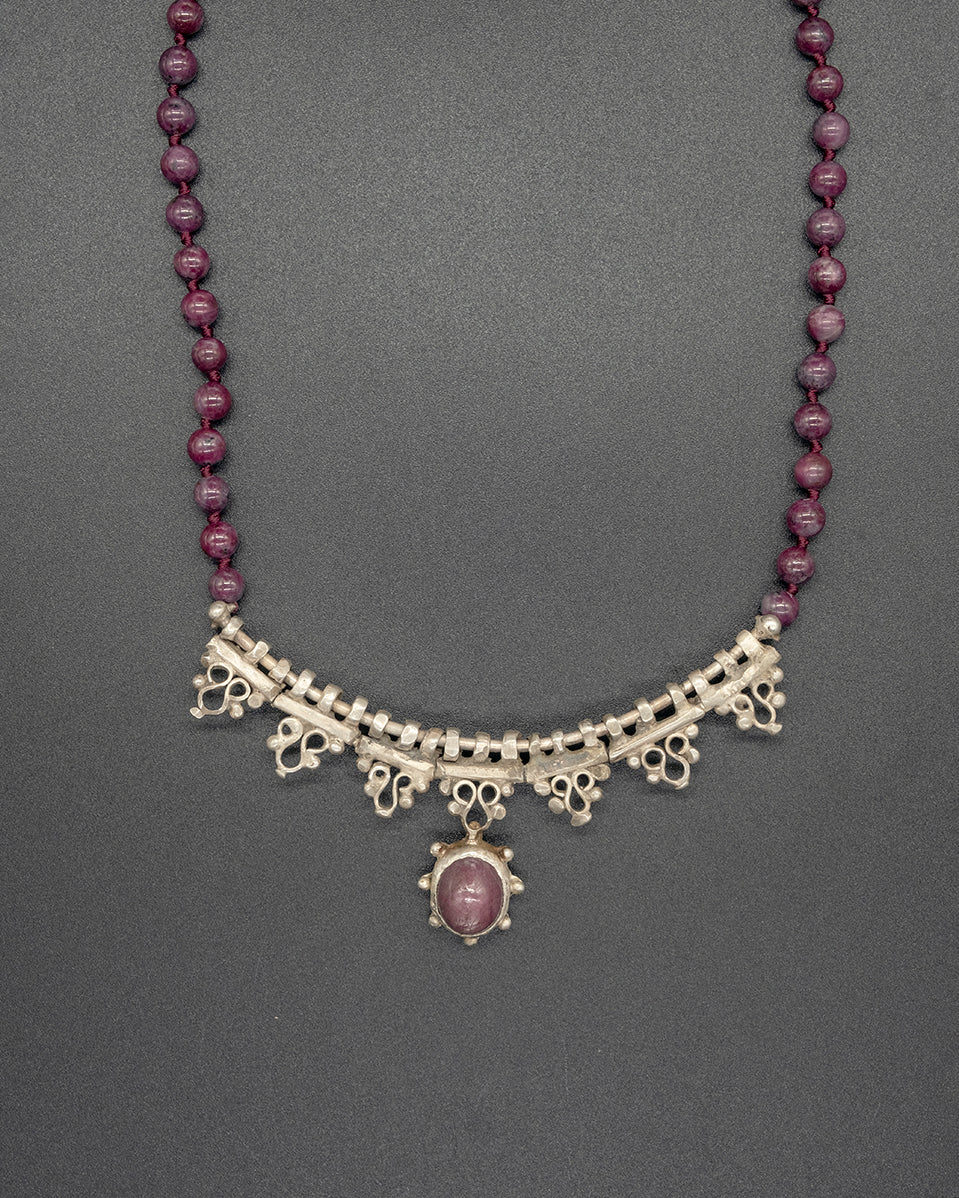 This piece features a Burma ruby set in silver, paired with a vintage silver African ruby chain. Rich in color and timeless in character, it carries a quiet elegance with artisanal depth.
