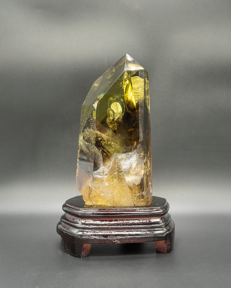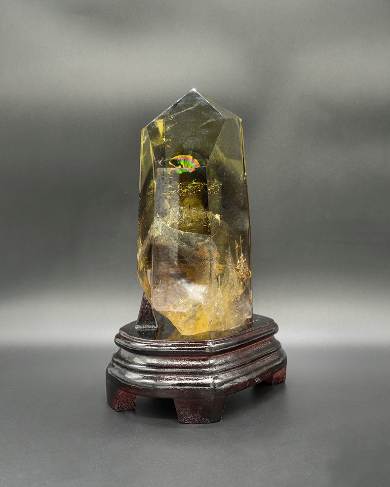 Embrace the power of yellow rutilated crystal with this stunning obelisk that is as beautiful as it is spiritually enriching. The hand-cut and polished crystal gleams with golden rays that add a touch of magic to any room. Known for its ability to promote spiritual growth and emotional healing, this unique piece is a must-have for anyone seeking to create a serene and harmonious atmosphere in their home or workspace. Display it proudly and let its energy work its wonders.