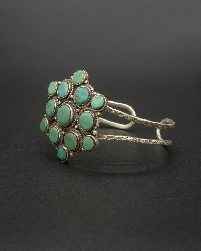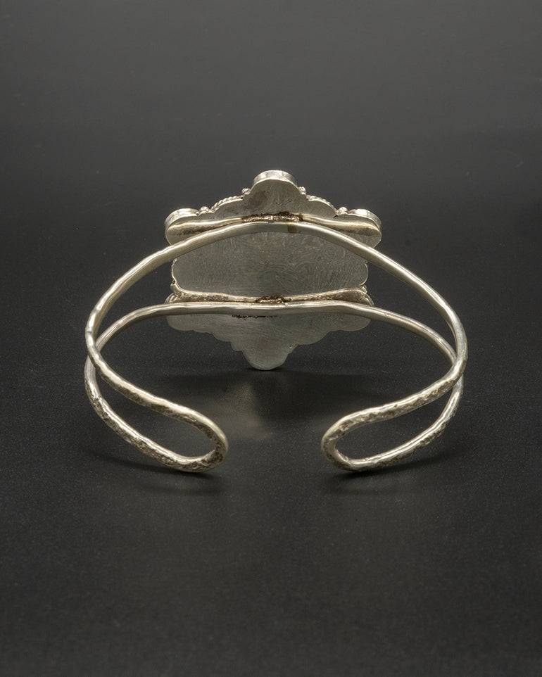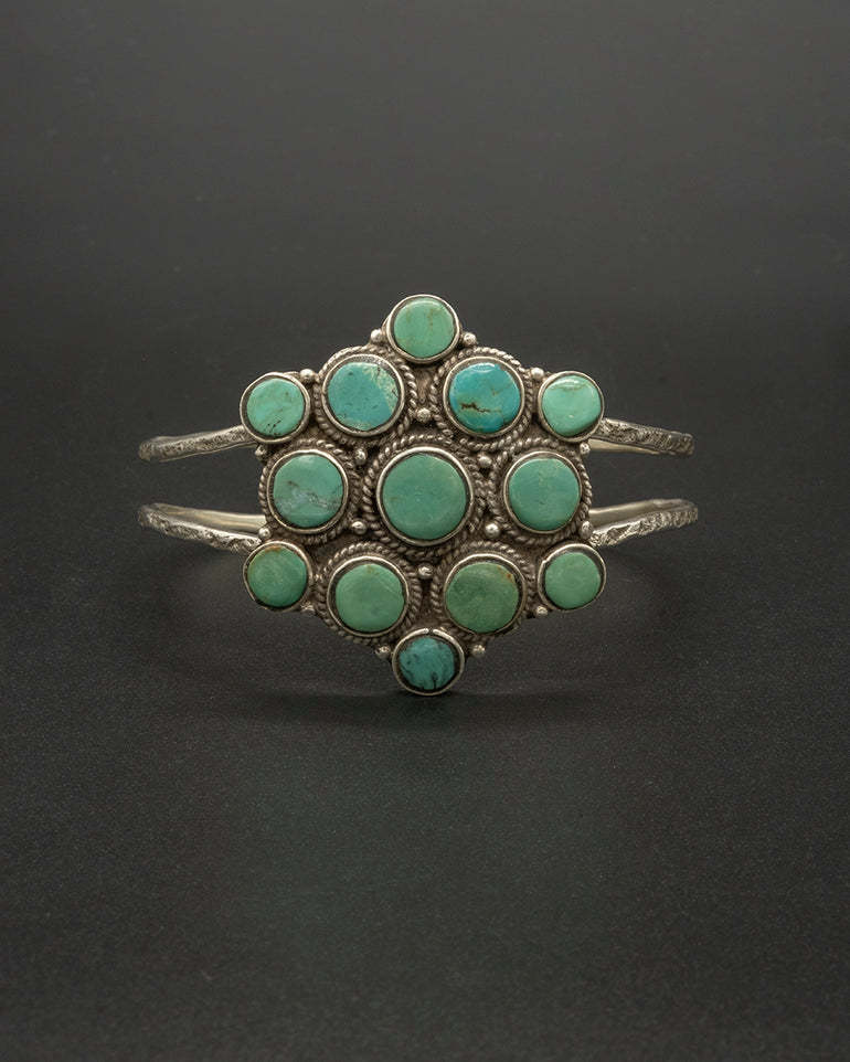 Transport yourself to the world of Nepalese artisans with this stunning handmade turquoise flower cuff. Crafted with an exquisite floral design, this cuff embodies the skill and talent of its makers. The beautiful turquoise hue adds a touch of calm to the intricate design.