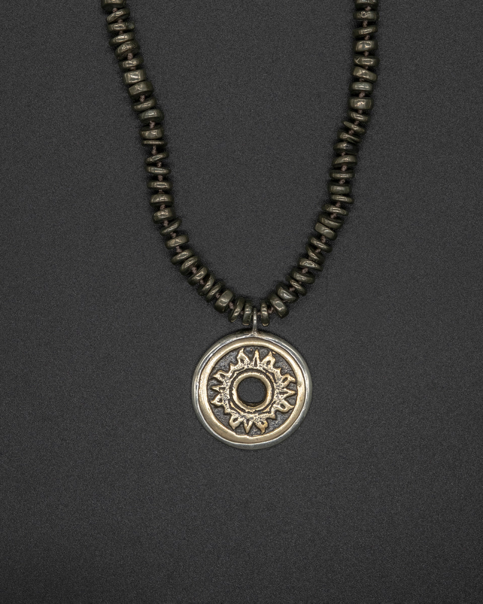 Inspired by divine power, this pendant features the Sudarshana Chakra, the celestial weapon of Lord Vishnu, symbolizing protection, righteousness, and clarity of vision. Paired with a hand-knotted pyrite chain, it radiates grounding energy and strength, blending spiritual power with earthly abundance.