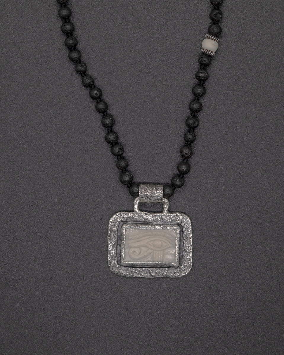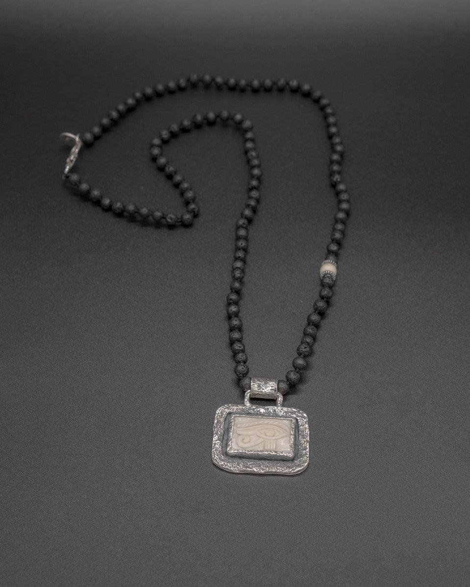 Unleash the full potential of ancient Egypt's rich culture with this exquisite Eye of Ra pendant. Skillfully crafted in Bali from sterling silver and bone, this striking masterpiece embodies the legacy of the legendary Egyptian symbol. Its lava stone, howlite, and silver chain are a testament to its premium quality, making it a piece that brings vitality and luck to you.