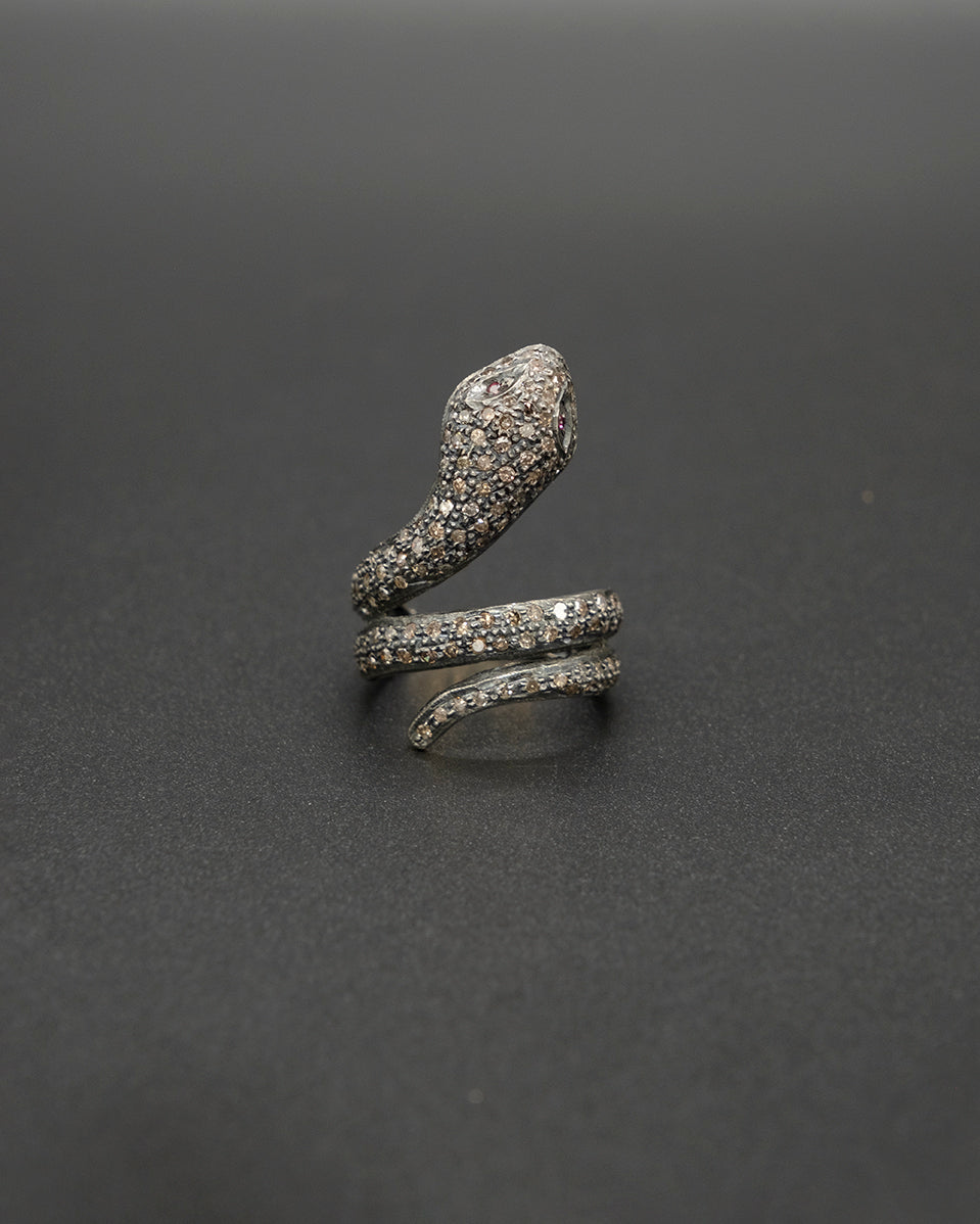 A sleek serpent coils gracefully around the finger, its head accented with a sparkling diamond and a vivid ruby eye. Set on a smooth gold-plated band, this ring blends mystique and elegance—symbolic, alluring, and beautifully crafted with a touch of ancient charm.